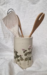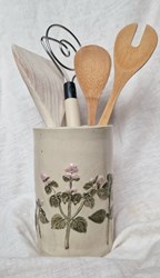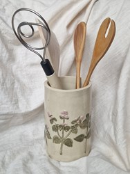 Unieke handgemaakte spatel/utensil houder van keramiek met een gedetaillerde 3d munt erop.